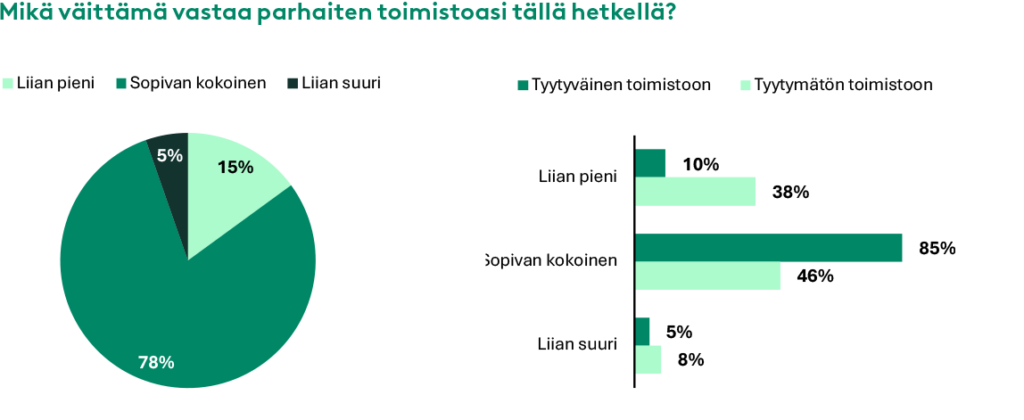 Suomalaisissa toimistoissa on tutkimuksen mukaan löytynytkin onnistunut tasapaino. Valtaosa suomalaisista toimistotyöntekijöistä pitää omaa työympäristöään juuri sopivan kokoisena. Poikkeukset kuitenkin kertovat, että jos tyytymättömyyttä ilmenee, se liittyy useammin siihen, että tila voisi olla suurempikin kuin nykyinen. Tutkimuksen perusteella liian pienet toimistot korreloivat selvästi matalamman tyytyväisyyden kanssa, kun taas suuremmat tilat eivät lisää merkittävästi tyytyväisyyttä.