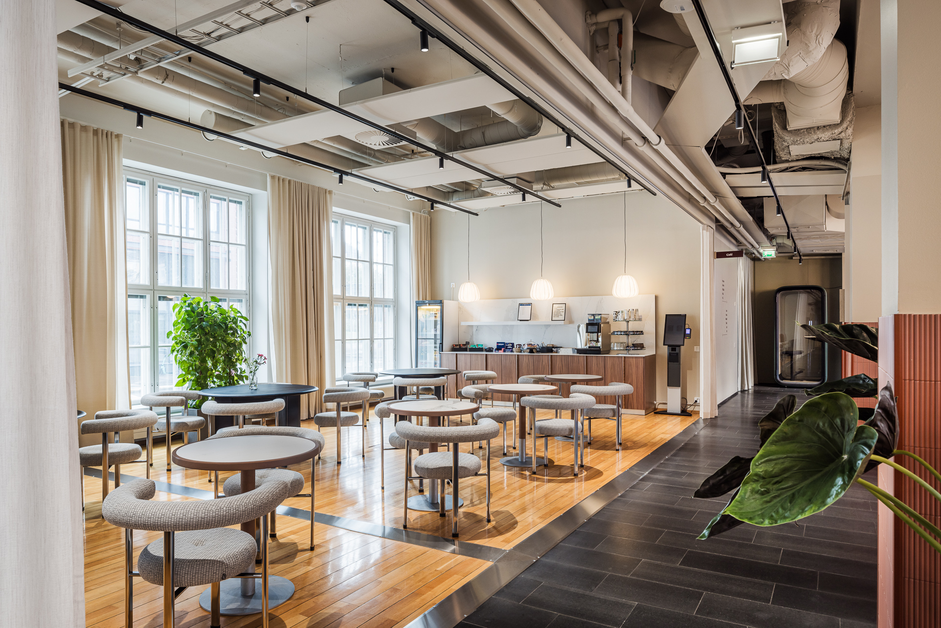 Menneisyys elää tiloissa sulassa sovussa modernien toimitilojen ja nykyaikaisen talotekniikan kanssa. Talo on saneerattu historiaa vaalien ja se henkii rouheaa industrial-tunnelmaa – osittain huonekorkeus yltää huimaan 4 metriin ja suuret ikkunat, avarat ja valoisat tilat luovat työympäristöön ainutlaatuisen tunnelman. Suojellun julkisivun ruutuikkunat tuovat tiloihin persoonallisen ilmeen.