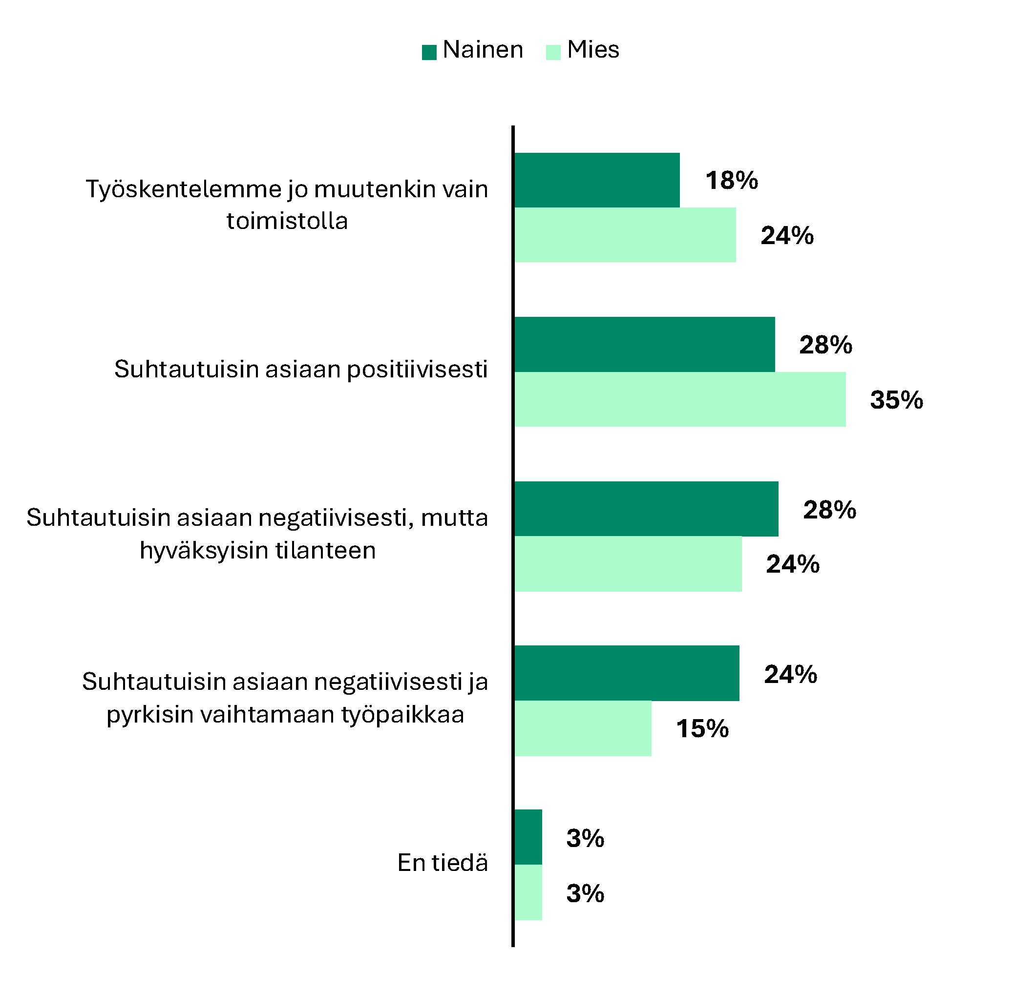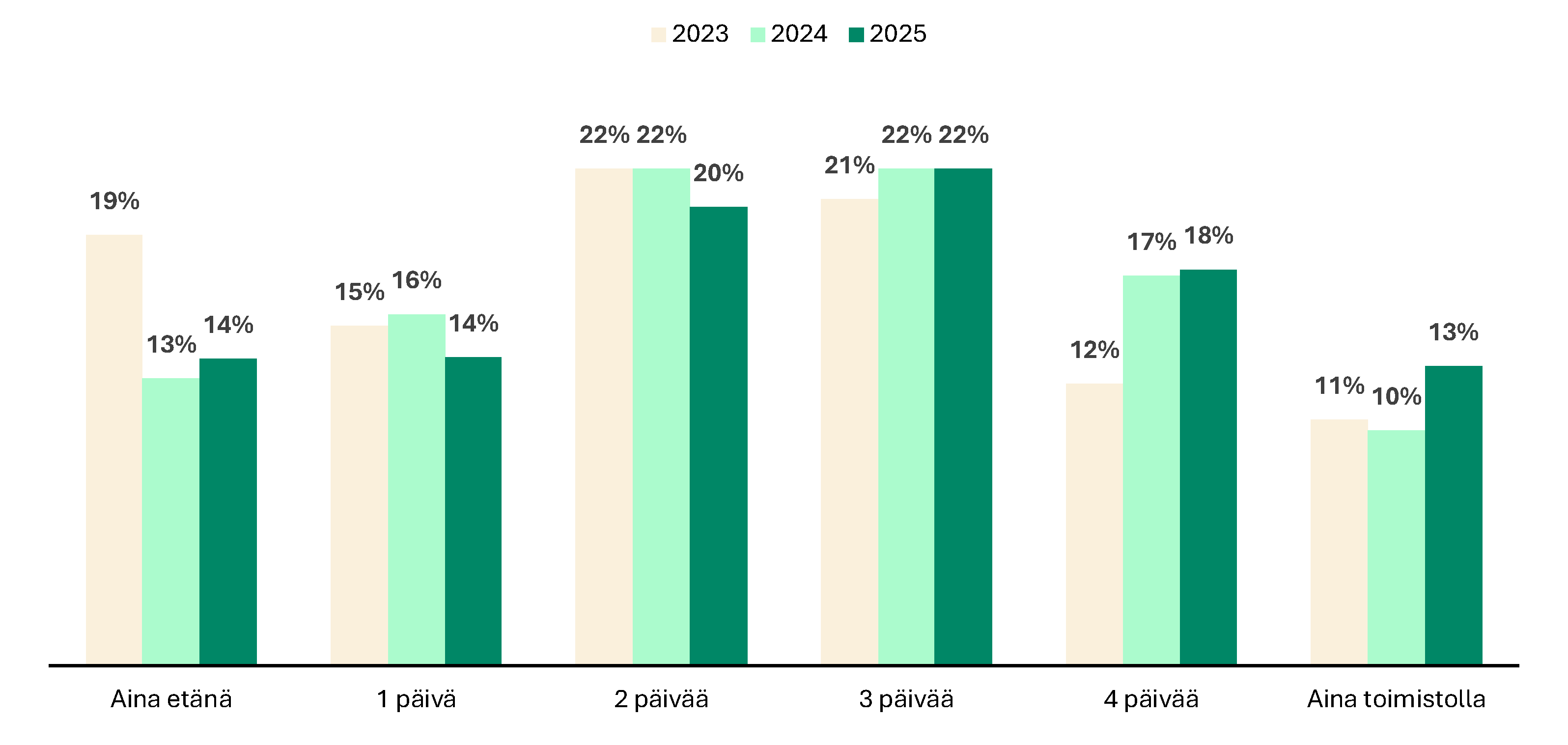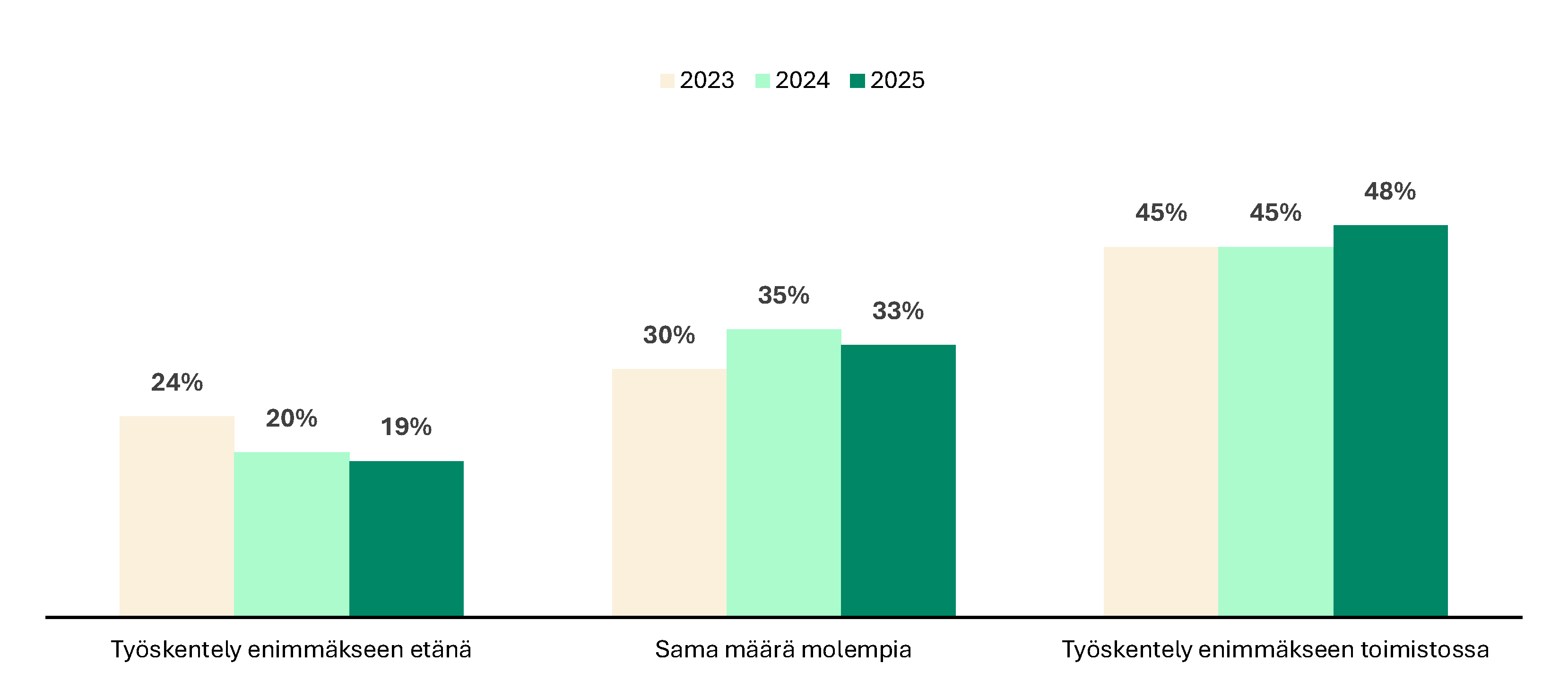 Vuodesta 2023 lähtien niiden osuus, jotka haluavat työskennellä pääasiassa toimistolla, on kasvanut 23 prosentista 31 prosenttiin. Myös niiden osuus, jotka haluavat työskennellä vain etänä, on vähentynyt 19 prosentista 14 prosenttiin.