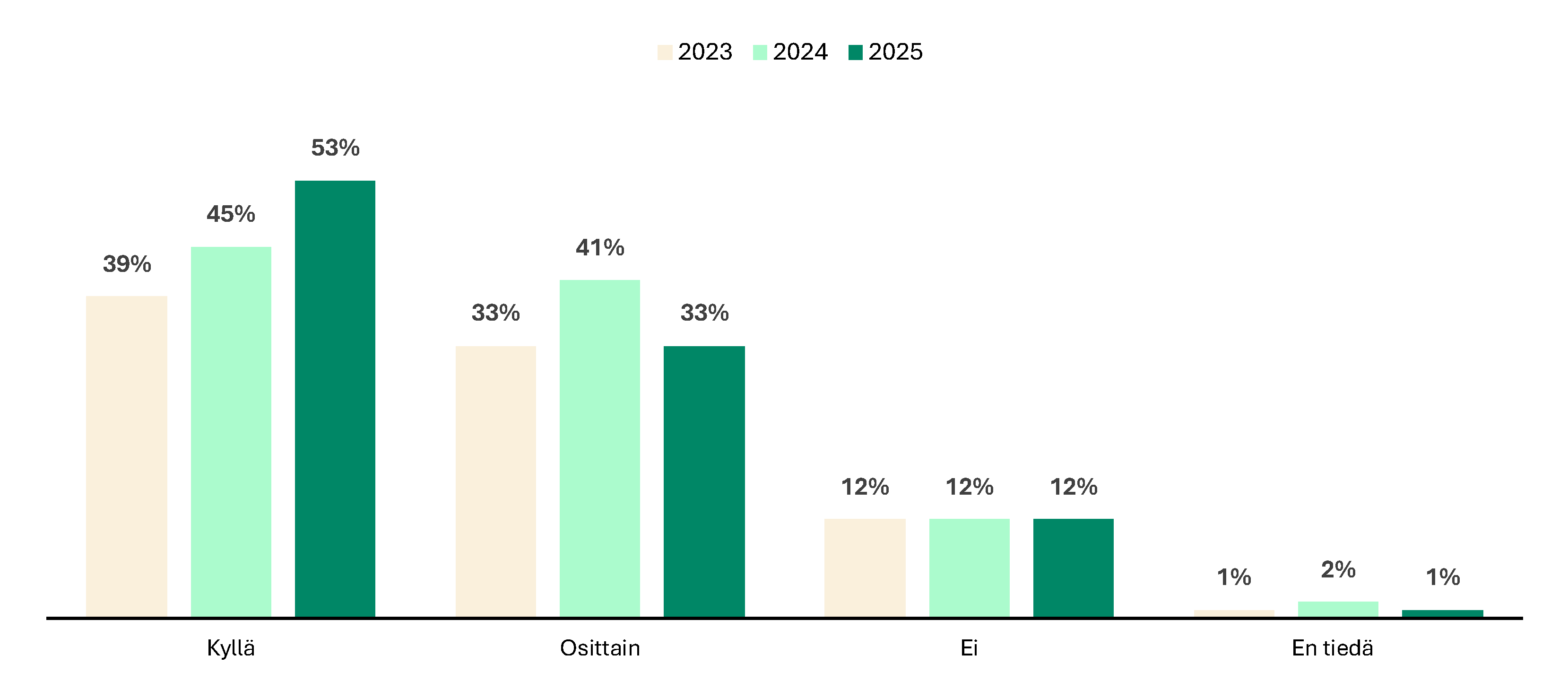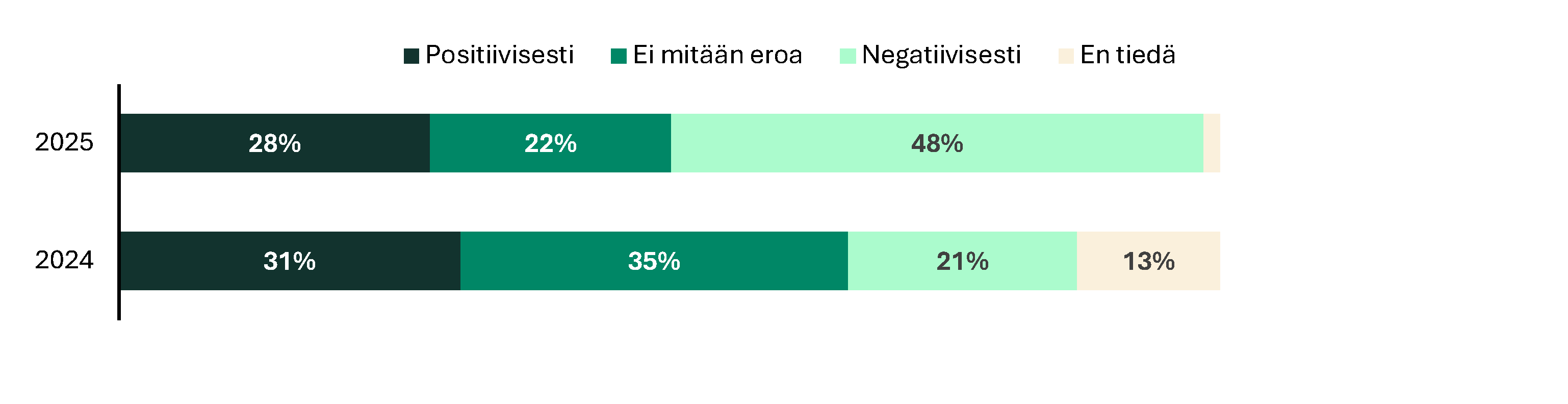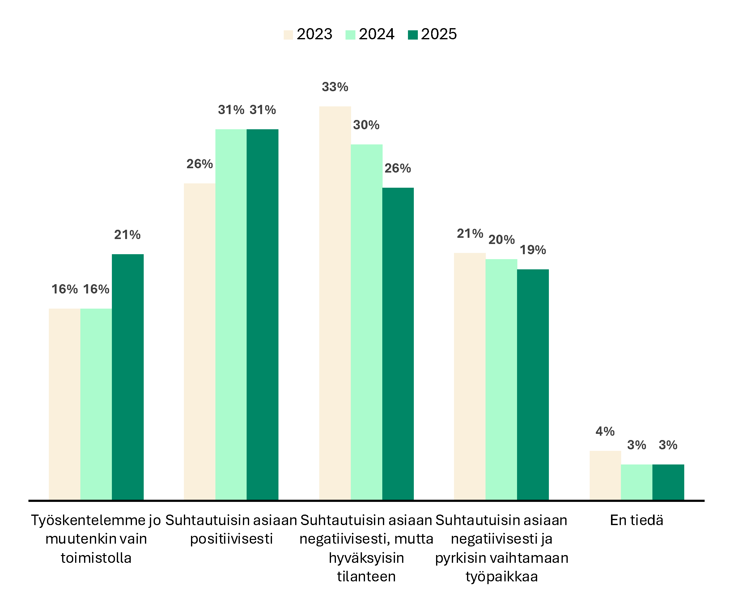 Vuodesta 2023 lähtien niiden osuus, jotka haluavat työskennellä pääasiassa toimistolla, on kasvanut 23 prosentista 31 prosenttiin. Myös niiden osuus, jotka haluavat työskennellä vain etänä, on vähentynyt 19 prosentista 14 prosenttiin.