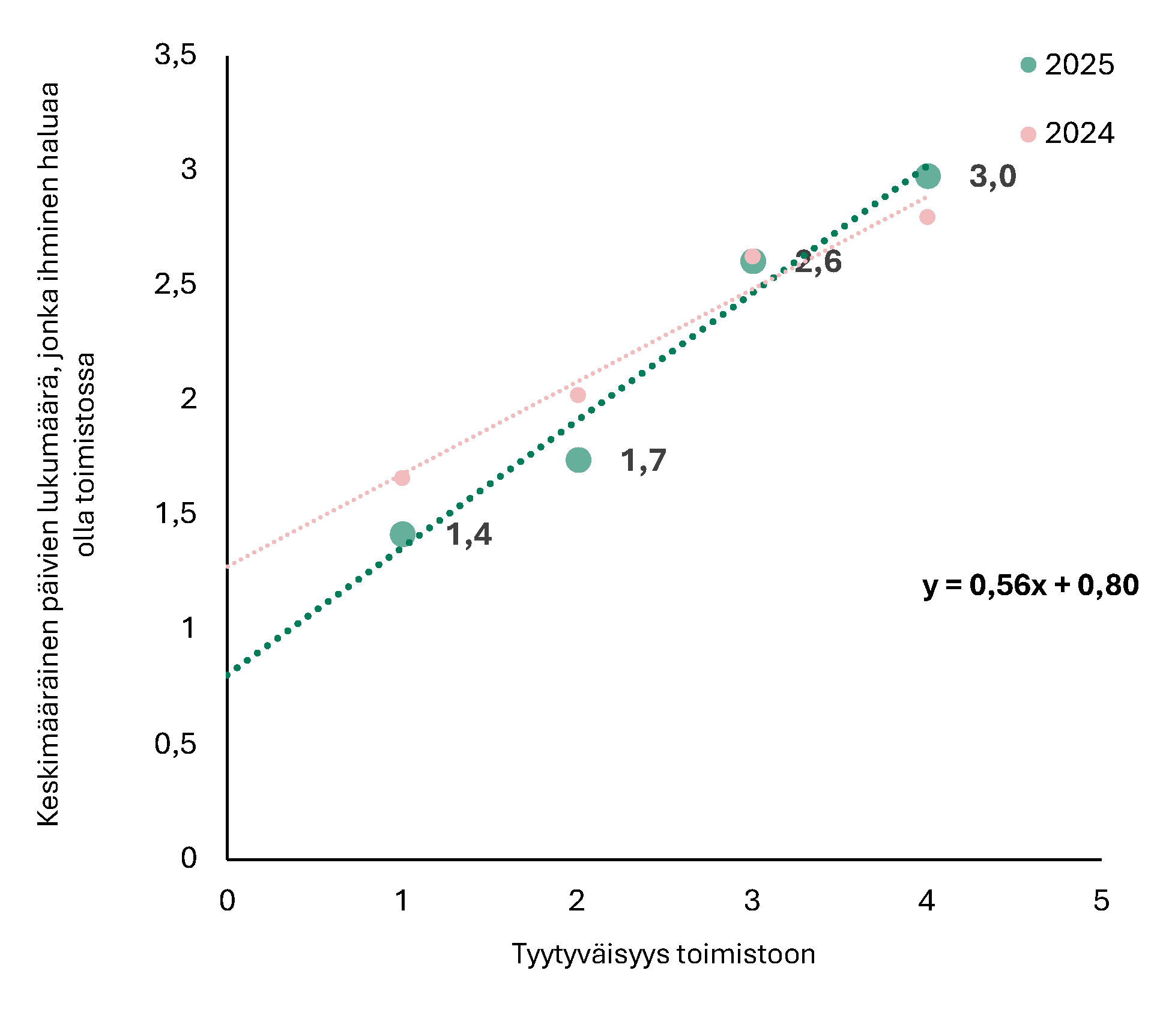 Se, kuinka tyytyväisiä toimistoympäristöön ollaan vaikuttaa selvästi siihen, kuinka usein toimistolla työskennellään. Mitä tyytyväisempiä ollaan, sitä useampana päivänä toimistolla halutaan työskennellä. Toimistoympäristöönsä tyytyväisimmät haluavat viettää keskimäärin 3,0 päivää toimistossa, kun taas tyytymättömimmät viettävät siellä 1,4 päivää.