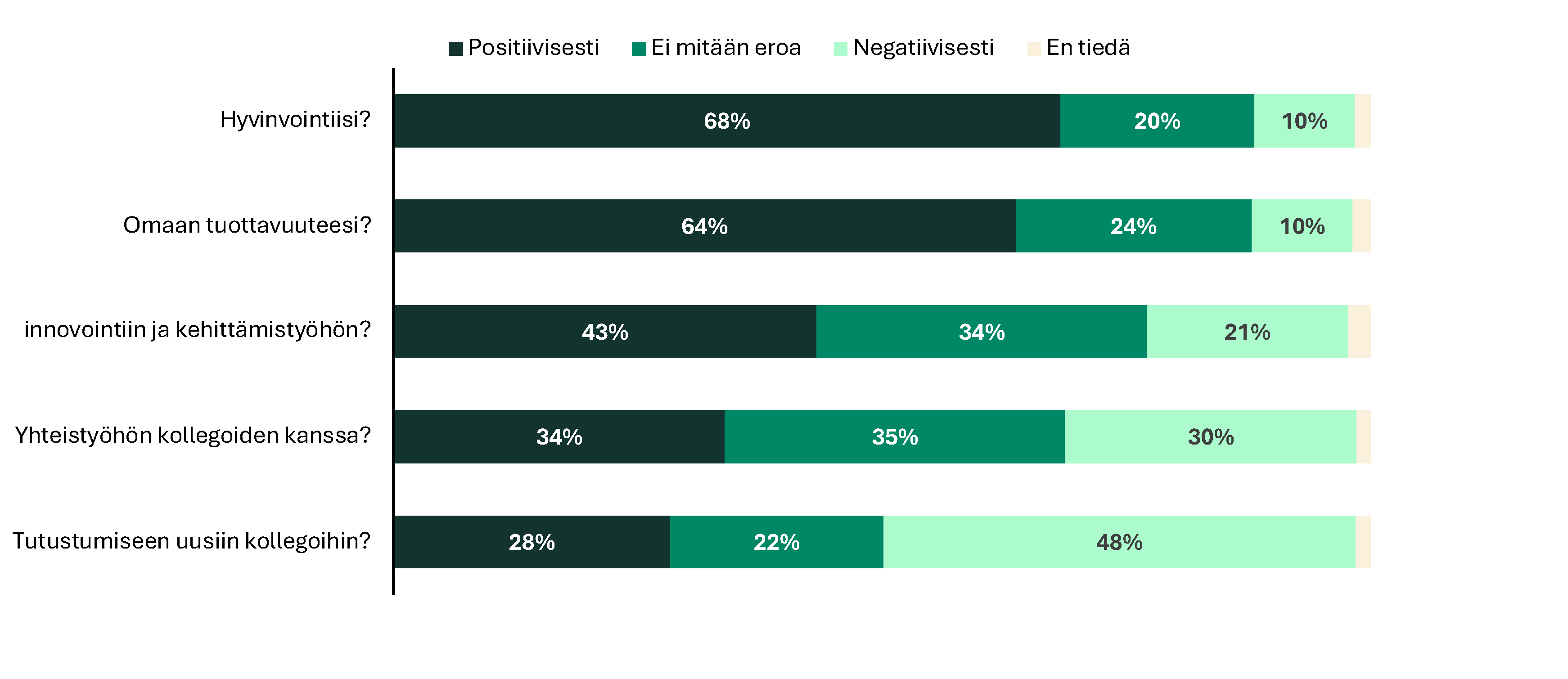 Useammat ihmiset kokevat kuitenkin haasteita uusien kollegoiden perehdyttämisessä. 48 % ilmoittaa, että etätyö vaikuttaa kielteisesti uusien kollegoiden perehdyttämiseen, kun edellisenä vuonna vastaava luku oli 21 %.