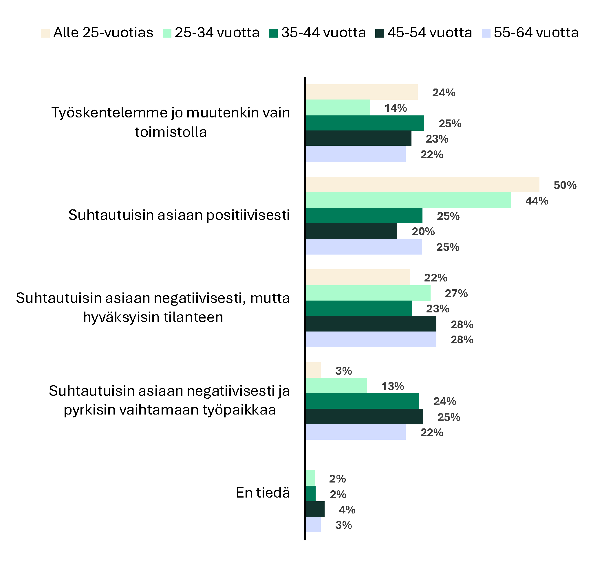Alle 25-vuotiaat toimistotyöntekijät (50 %) suhtautuvat myönteisimmin läsnäolovelvoitteeseen toimistolla. 45–54-vuotiaat ovat eri mieltä; vain 20 % olisi suhtautunut myönteisesti.