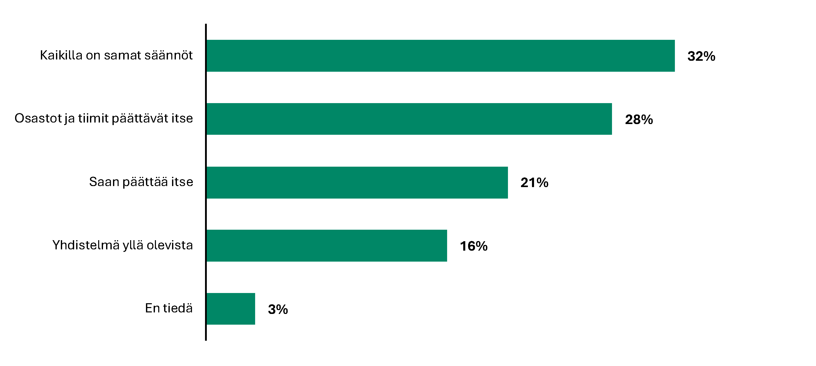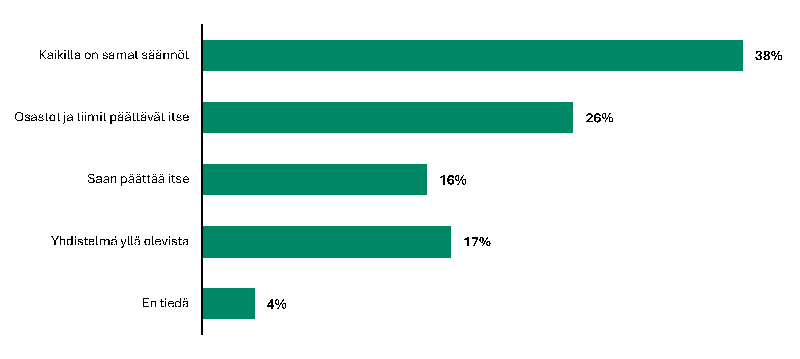 38 prosenttia sanoo, että etätyötä koskevat ohjeet ovat selviä kaikille heidän työpaikallaan. 26 % sanoo, että jokainen osasto tai tiimi päättää niistä itse. 16 % päättää itse, työskenteleekö toimistosta käsin vai etänä. 17 % ilmoittaa, että heidän saama ohjeensa on edellä mainittujen yhdistelmä.