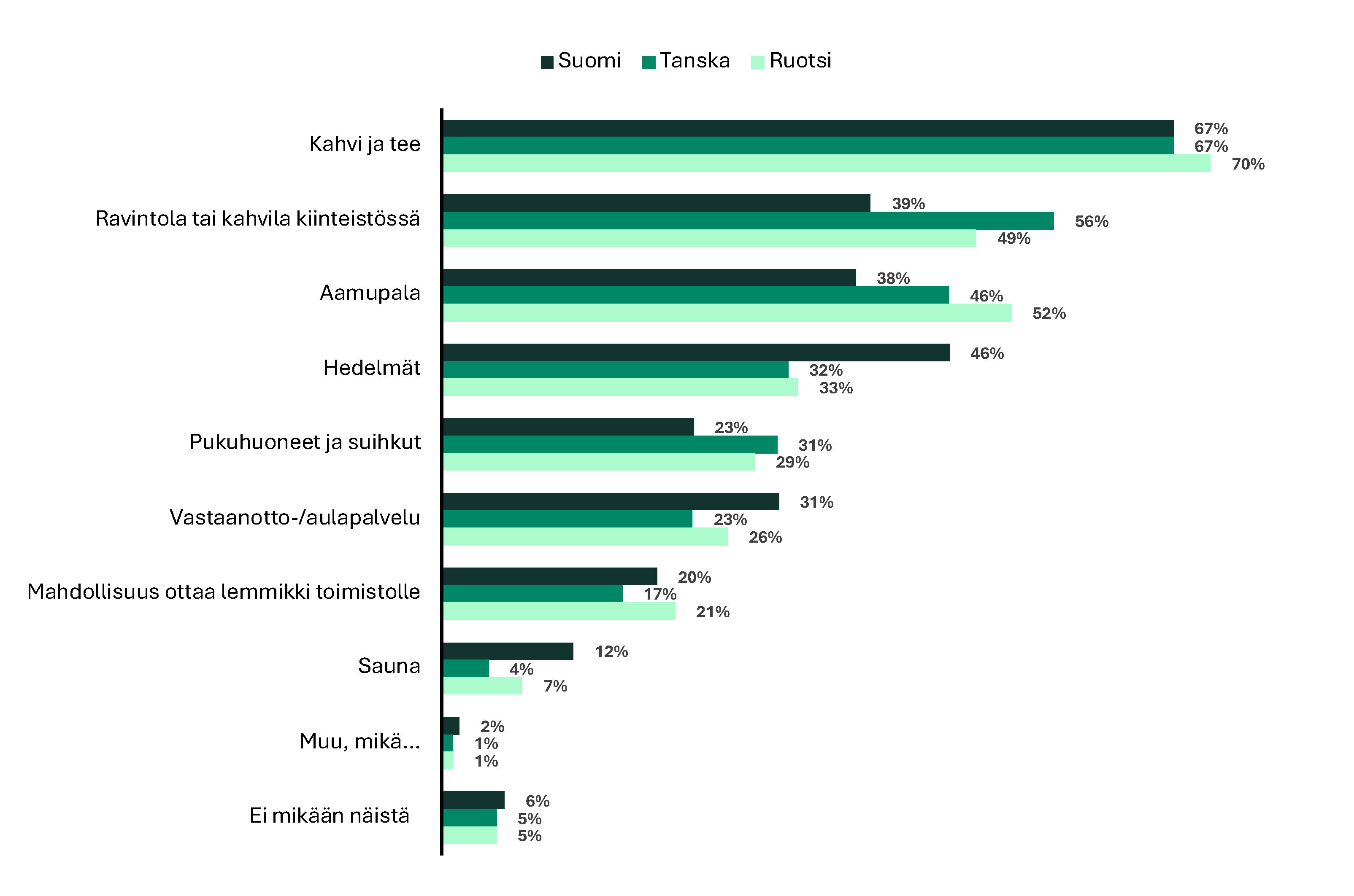 Myös työpaikan tarjoavat mukavuudet heijastavat suomalaisten mieltymyksiä. Toimiston yhteydessä sijaitsevaa ravintolaa tai kahvilaa arvostetaan erityisesti Suomessa, kun taas ruotsalaiset arvostavat hyvin varustettua hedelmäkoria ja tanskalaiset toimistolla tarjottua aamiaista. Laadukas kahvi ja tee ovat kuitenkin yleisesti ottaen tärkeitä kaikissa kolmessa maassa.