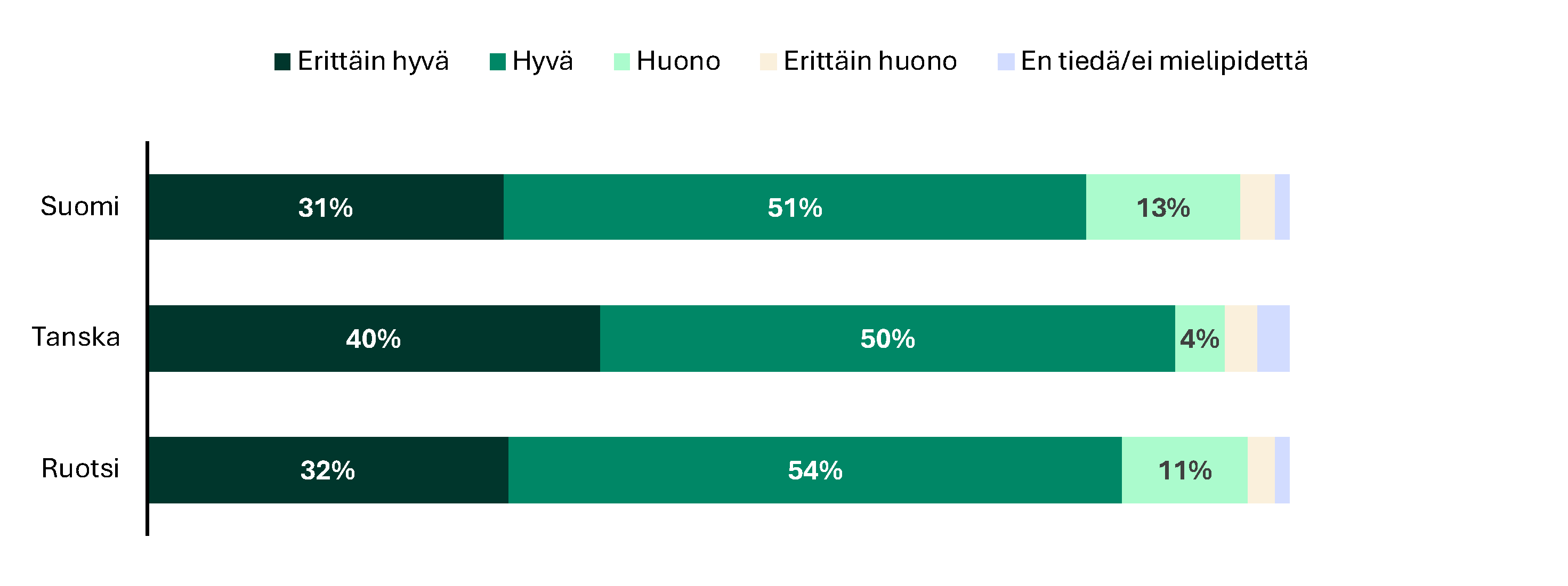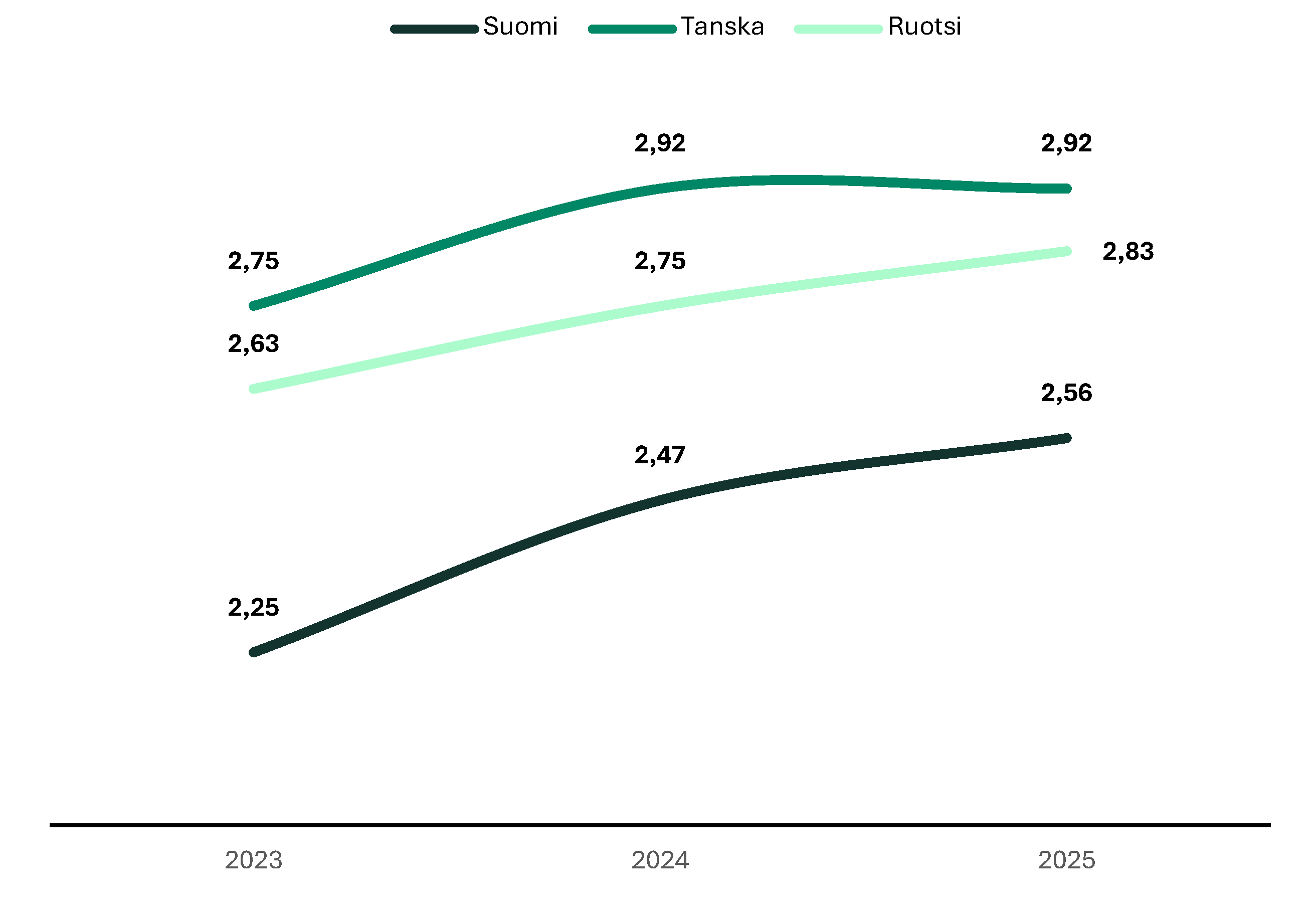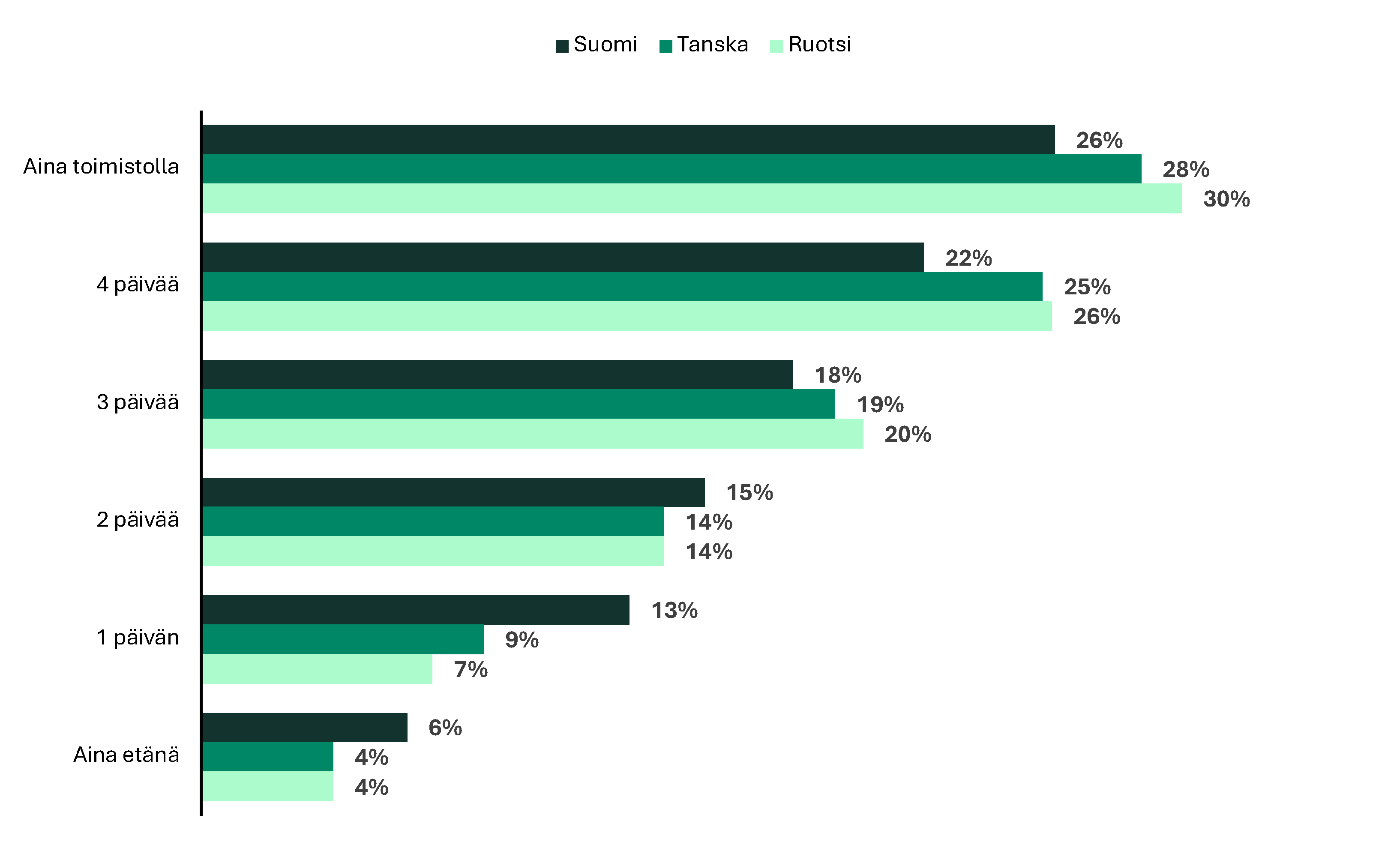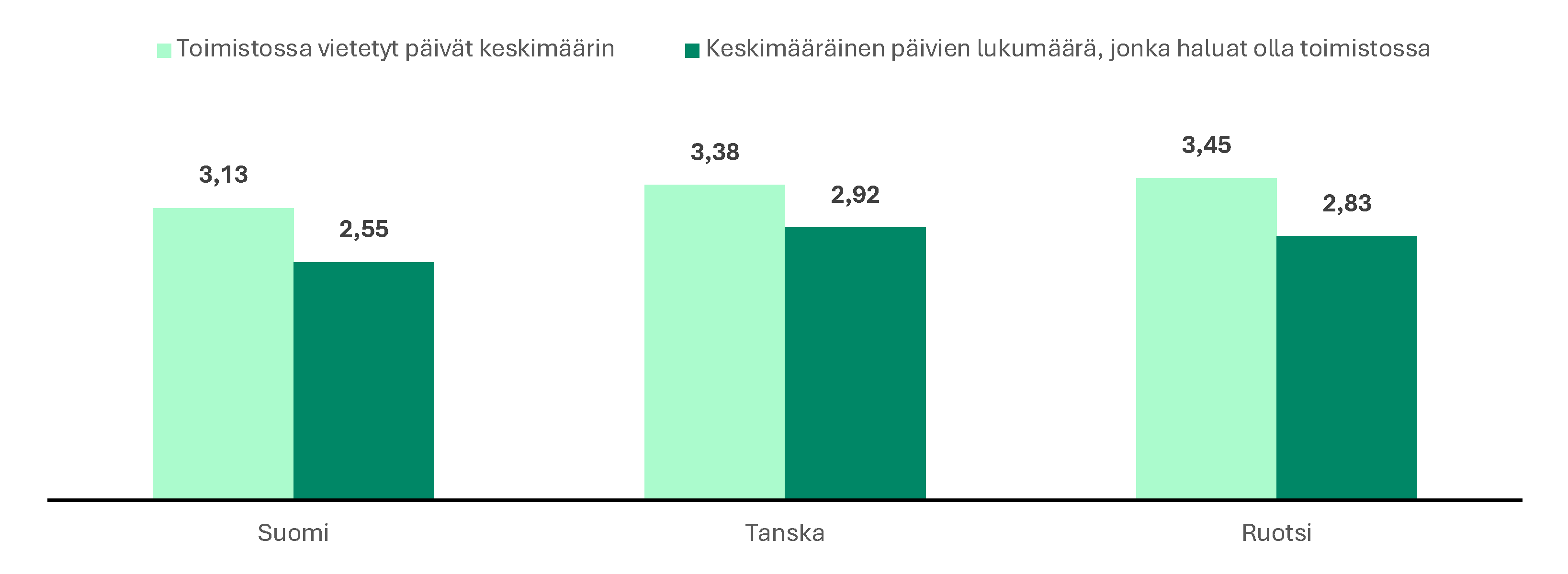 Suomalaiset toimistotyöntekijät viettävät keskimäärin 3,13 päivää viikossa toimistossa, mikä on hieman vähemmän kuin Ruotsissa (3,45 päivää) ja Tanskassa (3,38 päivää). Kolmen maan joukossa Suomessa on eniten etätyötä suosivia ihmisiä, 14 prosenttia, kun Ruotsissa heitä on 7 % ja Tanskassa 6 %. Tästä huolimatta joustavuus on edelleen työntekijöiden keskeinen prioriteetti kaikissa kolmessa maassa.