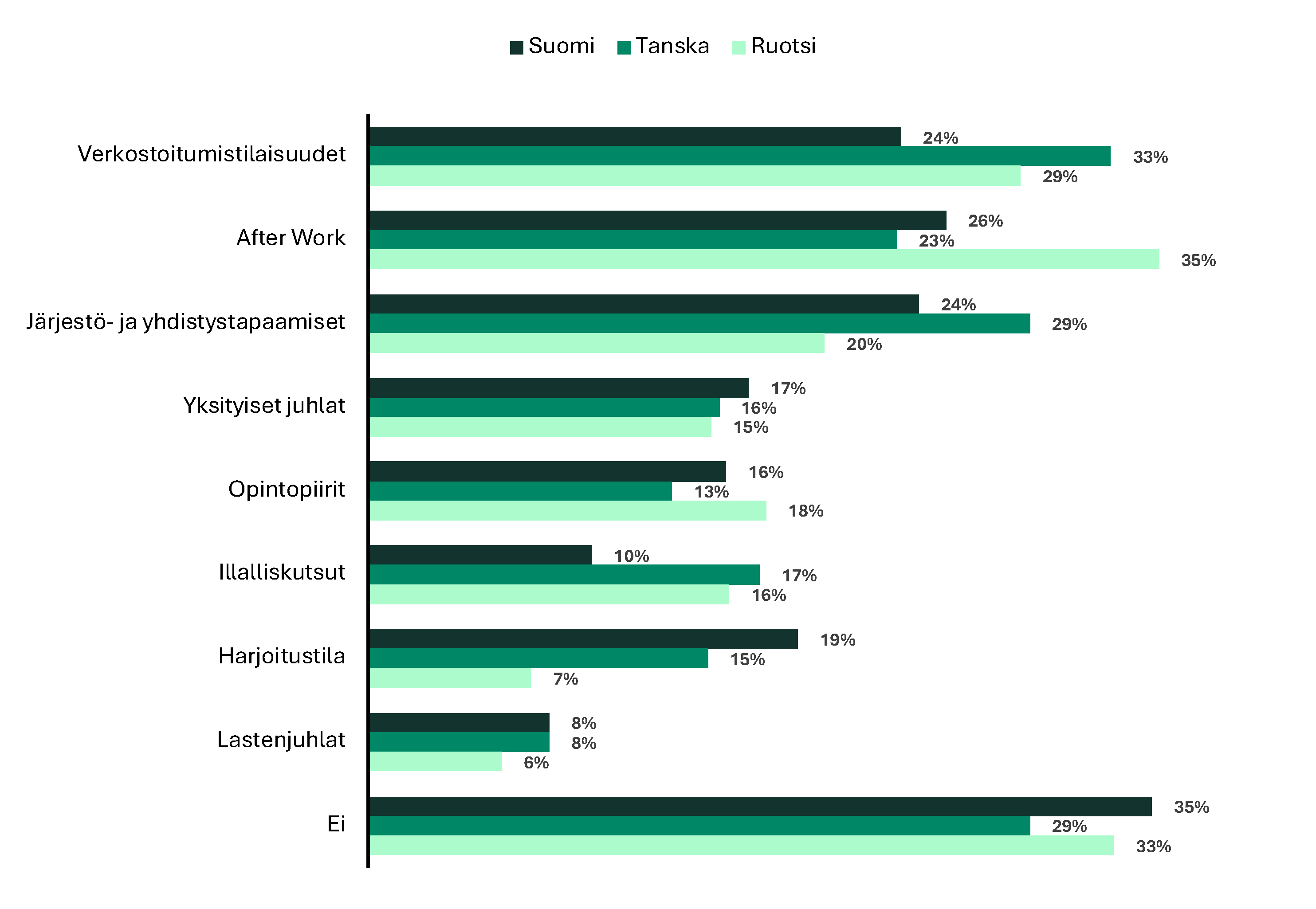 Ruotsalaiset suosivat työajan jälkeisiä kokoontumisia ja tanskalaiset verkostoitumista ja yhdistysten kokouksia, mutta suomalaiset, samoin kuin tanskalaiset, näkevät toimistotilojen käyttämisessä harjoitusten kaltaisiin toimintoihin enemmän potentiaalia.